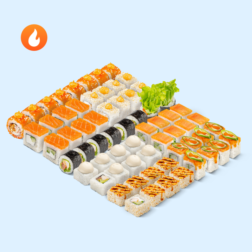 Хватит облизываться! Наслаждайся и делись с друзьями большими и сочными роллами под экзотическими соусами. Состав: Филадельфия с копчёным лососем лайт, Калифорния кранч том ям, Мексика фила, Филадельфия лайт, Том ям, Курочка том ям, Цезарь ролл, Том ям с креветкой