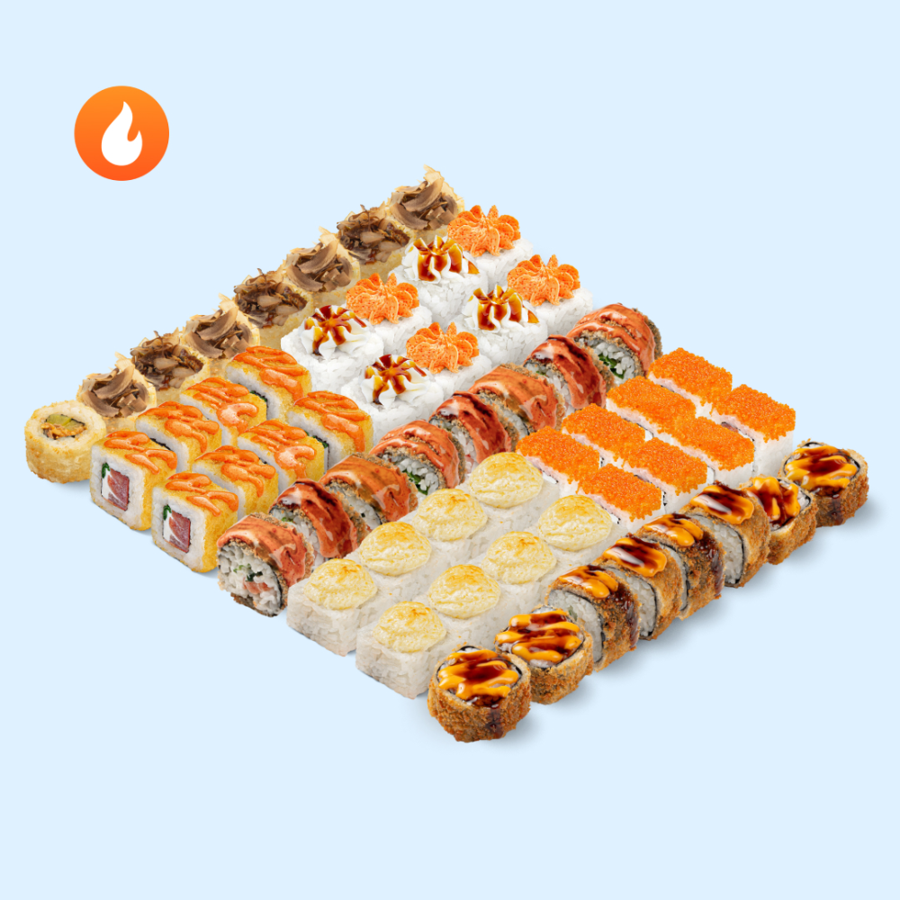 Пробуй на кухне и в спальне. Большой сет с лососем и морепродуктами подарит незабываемое удовольствие. Раздели его со второй половинкой. Состав: Чикен темпура, Спейшл NEW, Горячий лосось, Запеченный с курицей, Жаренный лосось чиз, Лосось с тобико NEW, Лава краб