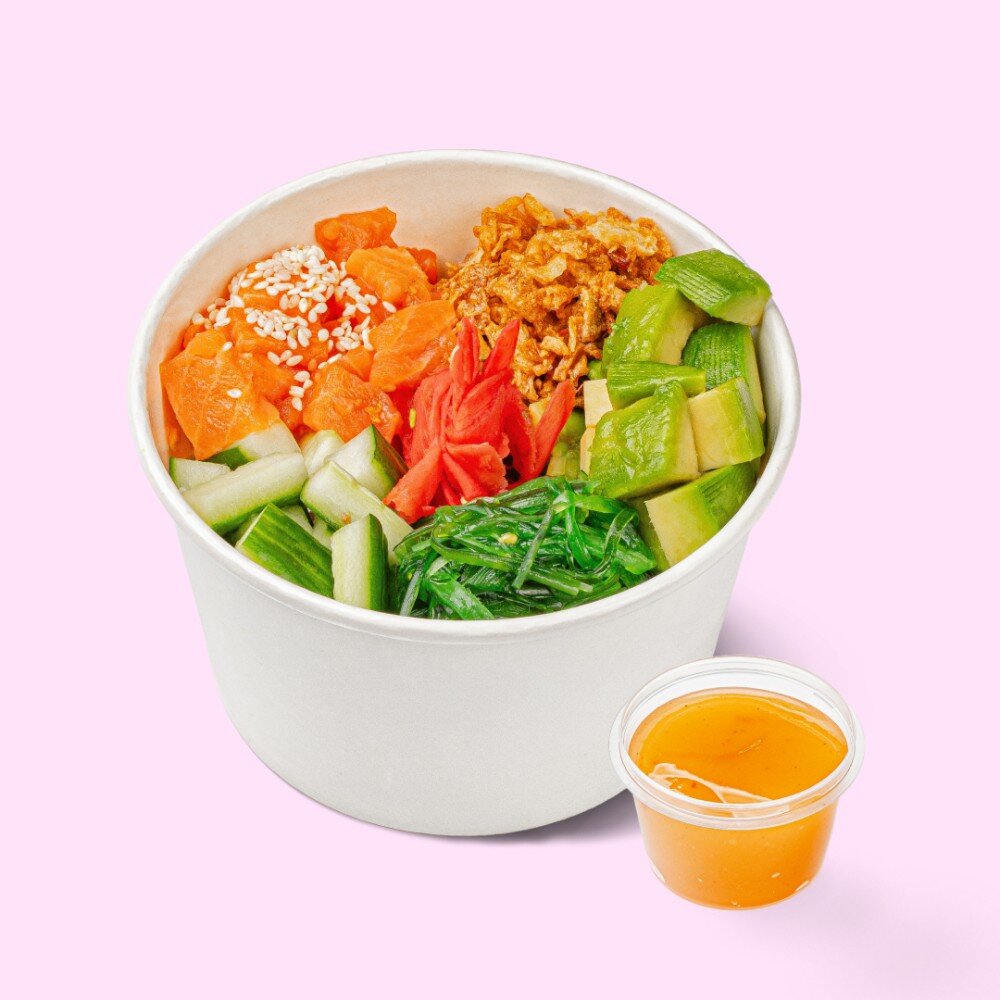 Рис, мицукан, сахар, комбу, соль, лосось, чукка, лук-кранч, авокадо, огурец, имбирь маринованый, чили краснуй, кунжут белый, соус свит-чили+том ям, соус манго-чили (отдельно)