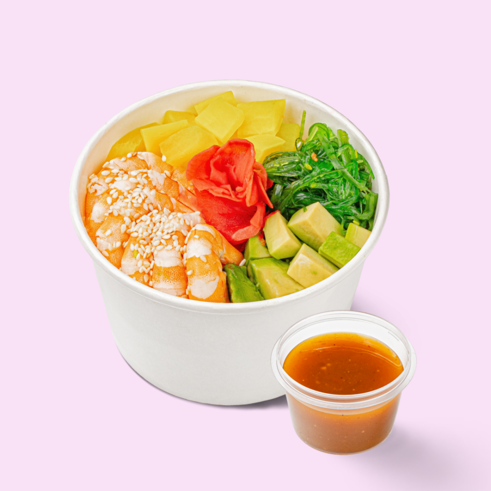 Рис, мицукан, сахар, комбу, соль, креветка, авокадо, чука, такуан, имбирь маринованный, тобико оранжевая, кунжут белый, соус свит-чили+том ям, соус лемограсс (отдельно).