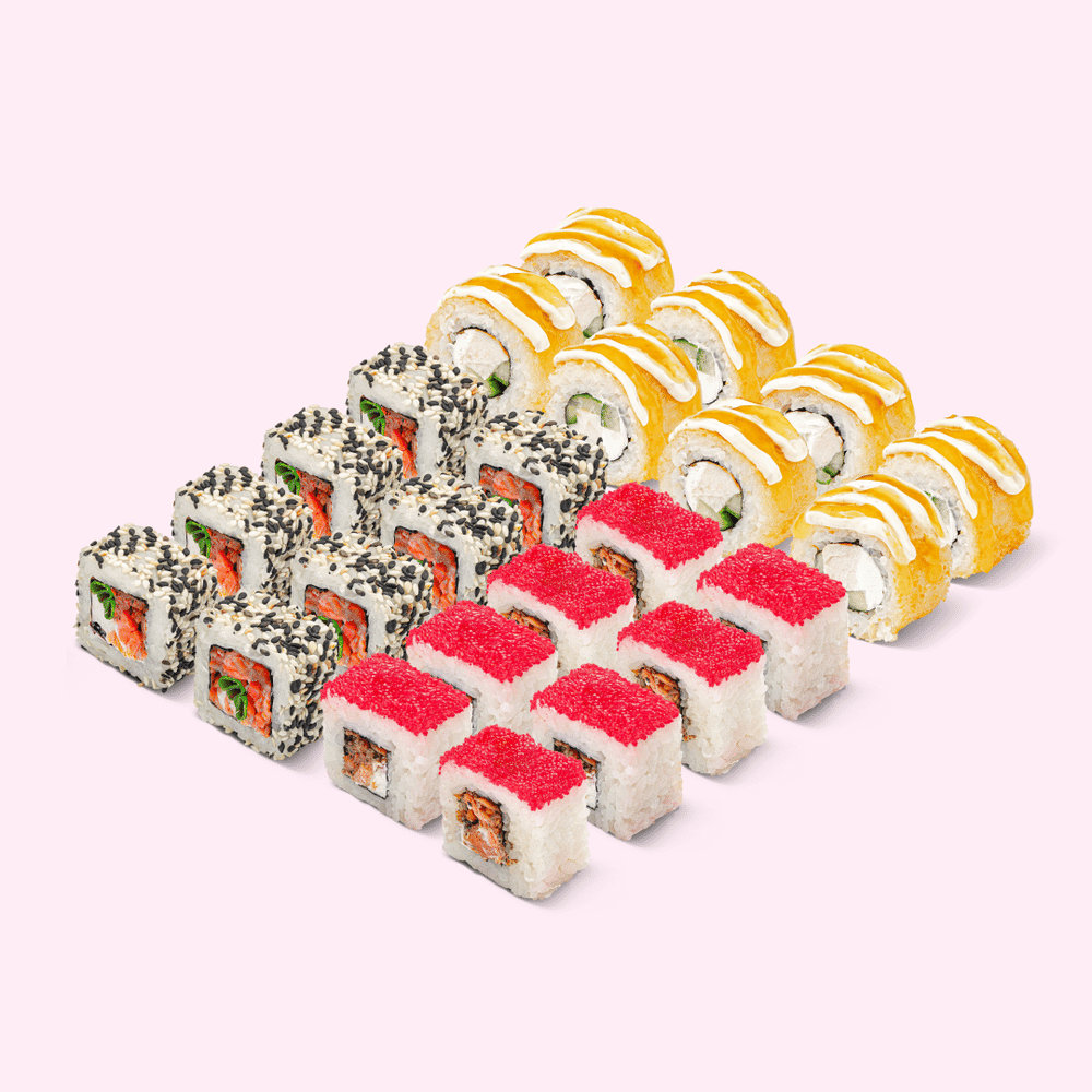 Хаяку стремится в твой рот — открой пошире. Пробуй набор с лососем, и курицей. Состав: Курица чили-ананас, Яркий лосось, Лосось с тобико