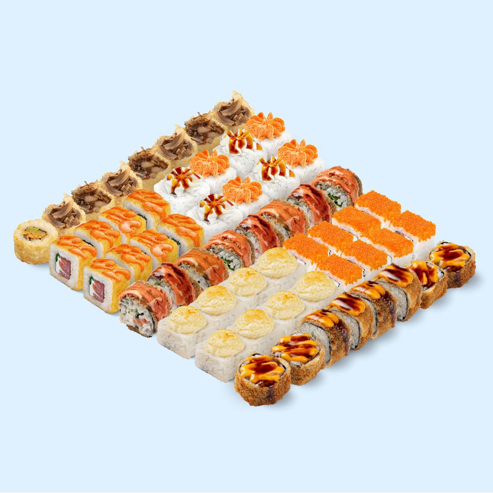 Пробуй на кухне и в спальне. Большой сет с лососем и морепродуктами подарит незабываемое удовольствие. Раздели его со второй половинкой. Состав: Чикен темпура, Спейшл NEW, Горячий лосось, Запеченный с курицей, Жаренный лосось чиз, Лосось с тобико NEW, Лава краб