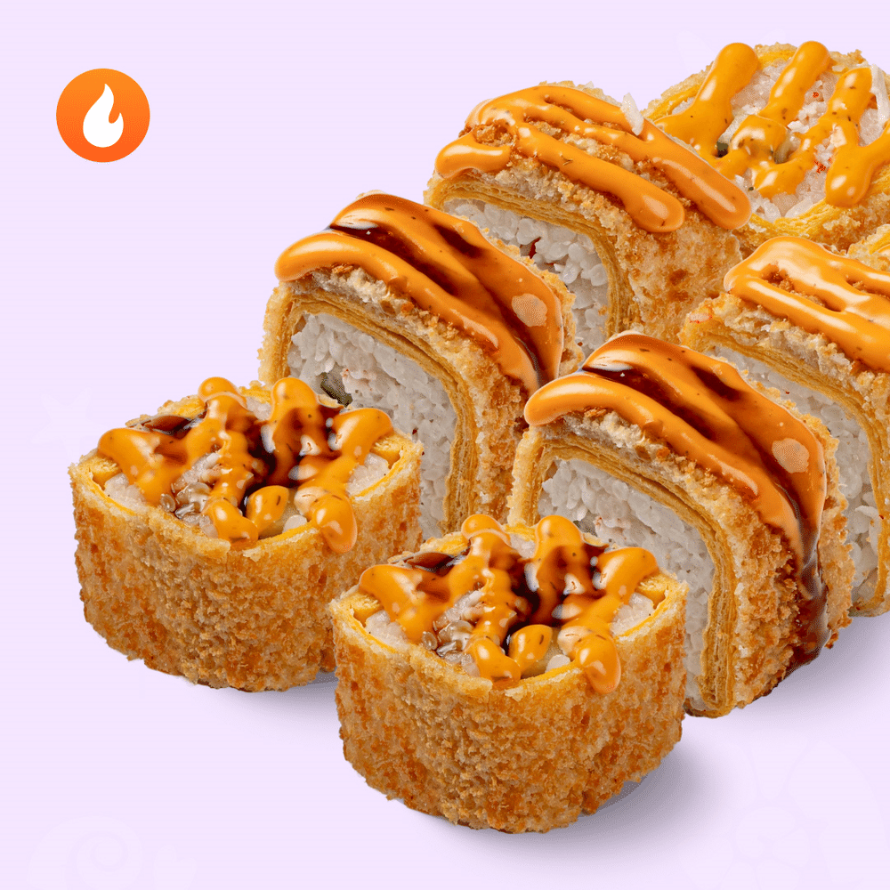 Пылкий краб, хрустящий лук и два ярких соуса. Состав: тортилья,рис отварной, сыр сливочный, краб с майонезом, огурец, кляр, сухари, соус унаги, соус 1000 островов