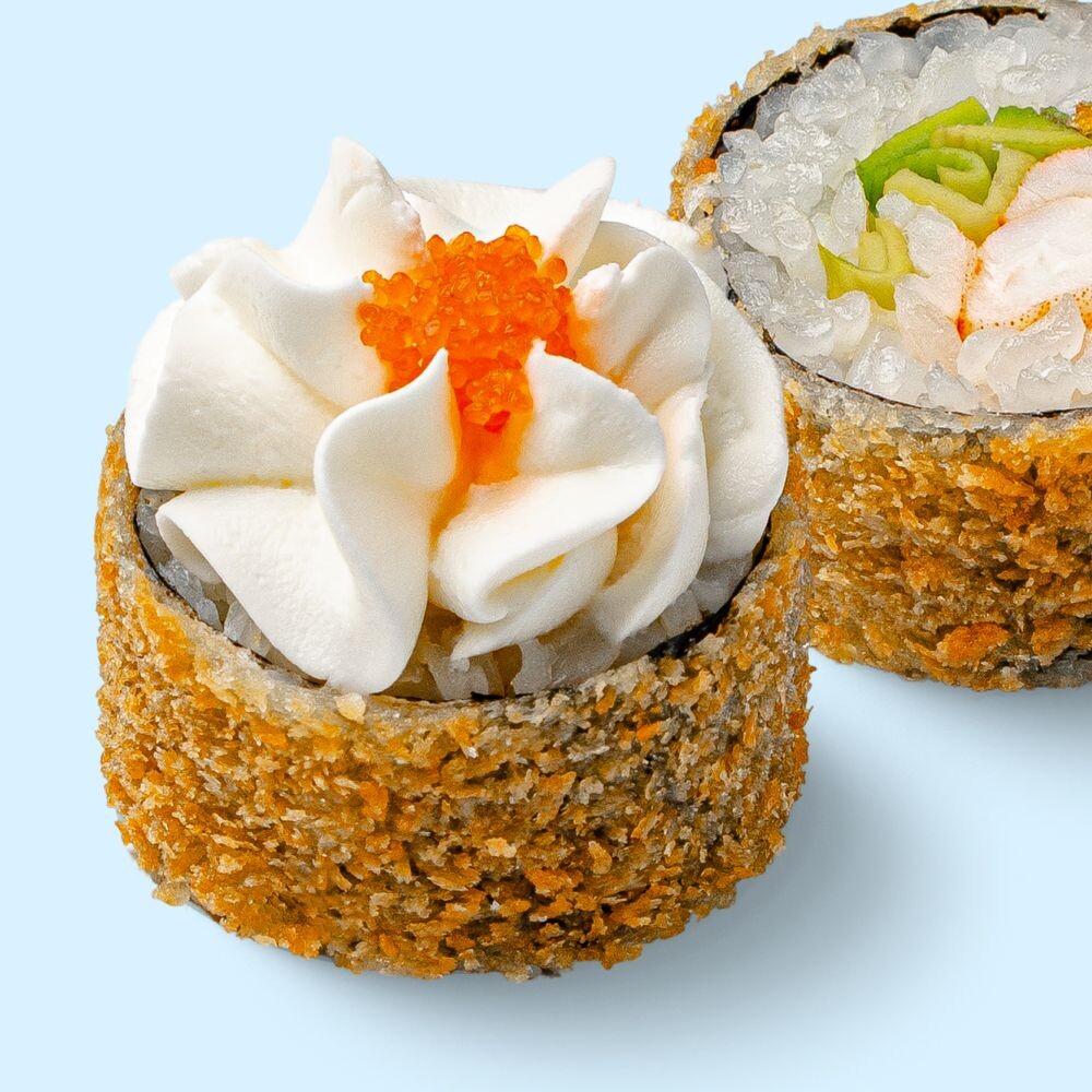 Рис, мицукан, сахар, комбу, соль, нори, креветка, авокадо, мука, яйцо, сухари панировочные, сыр сливочный, тобико