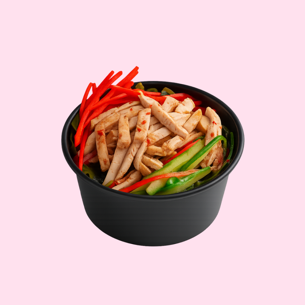 Вакаме, огурец, перец болгарский, помидоры черри, филе куриное, приправа куриная, масло подсолнечное, майонез, чеснок, соевый соус, маринованные огурцы.