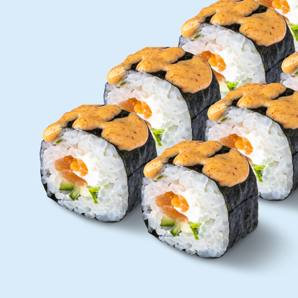 Рис, мицукан, сахар, комбу, соль, нори, лосось холодного копчения, огурец, сыр сливочный, лук зелёный, майонез, паста кимчи